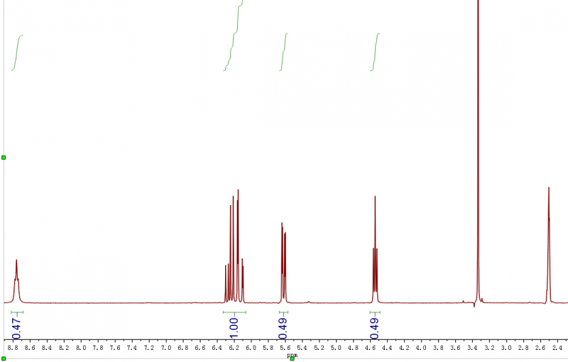 氢谱8.6左右的是活泼氢,被CH2 (化学位移4.6左右)裂分为三峰。CH2也为三峰。按照这个推测,应该有-CH2NH2 片断。根据积分比例,还有6个氢没有归属,是2个丙烯酸片断。