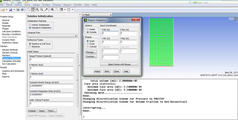 大家好 ,我研究的是冷却管的降膜流动,管子的内壁有薄水膜覆盖,中间走的是高温的合成气,我的问题是fluent里面的region Adaption怎么设置?就是那几个选项不知道怎么选?在这里耽误很长时间了,很急,谢谢大家了。。 IOP(5ZACS7I}10`I$2~012S.jpg |