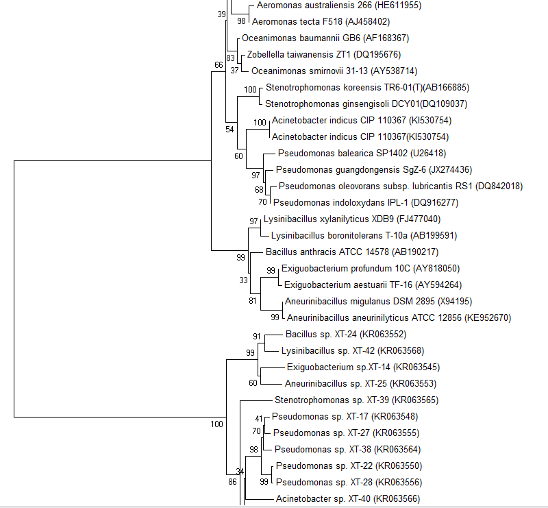 这个是我做的系统发育树,我的菌的编号是XT-3,XT-是我的菌,其他为选出来的相似度高的序列,可做出来的树为什么我自己的菌在一个分支上,其他序列在另一分支上?怎么会出现这种情况?求指教。。。。