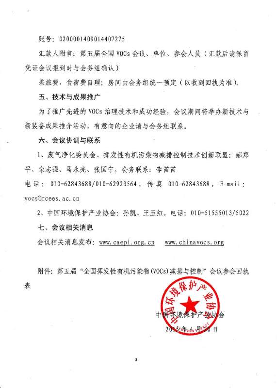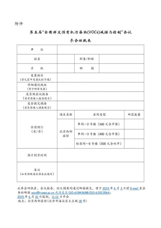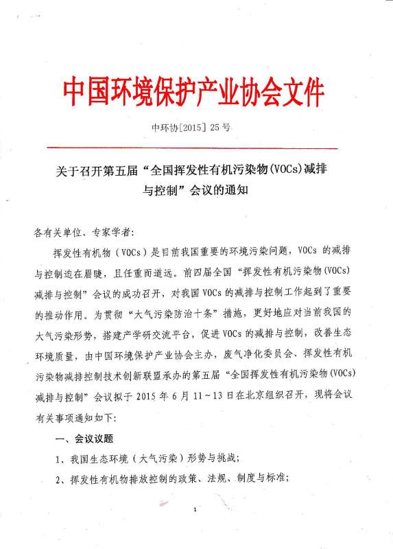 关于召开第五届“全国挥发性有机污染物(VOCs)减排与控制”会议的通知 挥发性有机物(VOCs)是目前我国重要的环境污染问题,VOCs的减排与控制迫在眉睫,且任重而道远。前四届全国“挥发性有机污染物(VOCs)减排与控制”会议的成功召开,对我国VOCs的减排与控制工作起到了重要的推动作用。为贯彻“大气污染防治十条”措施,更好地应对当前我国的大气污染形势,搭建产学研交流平台,促进VOCs的减排与控制,改善生态环境质量,由中国环境保护产业协会主办,废气净化委员会、挥发性有机污染物减排控制技术创新联盟承办的第五届“全国挥发性有机污染物(VOCs)减排与控制”会议拟于2015年6月11~13日在北京组织召开,现将会议有关事项通知如下: 一、会议议题 1、我国生态环境(大气污染)形势与挑战; 2、挥发性有机物排放控制的政策、法规、制度与标准; 3、挥发性有机物的来源、排放、控制、治理及影响; 4、挥发性有机物的检测、监测、分析的技术与设备; 5、挥发性有机物污染控制新材料、新技术与新装备; 6、挥发性有机物污染控制工程应用与案例分析。 为便于编印会议资料,请于6月5日前将报告摘要/论文摘要(包括题目、作者、通讯地址和摘要,摘要内容300-500字为宜)发送至邮箱vocs@rcees.ac.cn,便于我们统一制作并及时发给参会人员。 二、参会人员 环保管理部门、生产企业、工程公司、行业协会、科研单位和监测机构的相关专家、学者、技术与管理人员。 三、 时间、地点 时间:2015年6月11~13日(6月10日报到,6月11~13日开会) 地点:北京西郊宾馆 四、注册费用及注意事项 注册费用:1200元/人(会议费、资料费等,在校生800元/人),费用优惠:同一单位2人参会1100元/人,3人以上参会1000元/人,预注册交费截止至2015年6月3日,6月3日以后以及现场注册费用为1500元/人。 请各有关单位在收到通知后,于6月3日前将参会报名表(附件)反馈至会务组邮箱vocs@rcees.ac.cn或传真至010-62843688,并将会议注册费汇至以下账户: 收款单位:中国环境保护产业协会 开户行:工商行北京百万庄支行 账号:0200001409014407275 汇款人附言:第五届全国VOCs会议、单位、参会人员(汇款后请保留凭证会议报到时与会务组确认) 差旅费、食宿费自理;房间由会务组统一预定(以收到回执为准)。 五、技术与成果推广 为了推广先进的VOCs治理技术和成功经验,会议期间将举办新技术与新装备成果推介活动,有意向的企业请与会务组联系。 六、会议协调与联系 1、废气净化委员会、挥发性有机污染物减排控制技术创新联盟:郝郑平、栾志强、马永亮、张国宁,会务联系电话:010-62843688/010-62923564, 传真010-62843688,E-mail:vocs@rcees.ac.cn 2、中国环境保护产业协会:孙凯、王玉红,电话:010-51555013/5022 七、会议相关消息 会议相关消息发布:www.caepi.org.cnwww.chinavocs.org 附件:第五届“全国挥发性有机污染物(VOCs)减排与控制”会议参会回执表 中国环境保护产业协会 2015年4月20日 第五届“全国挥发性有机污染物(VOCs)减排与控制会议”的通知-001.jpg 第五届“全国挥发性有机污染物(VOCs)减排与控制会议”的通知-002.jpg 第五届“全国挥发性有机污染物(VOCs)减排与控制会议”的通知-003.jpg vocs会议-参会回执.jpg |