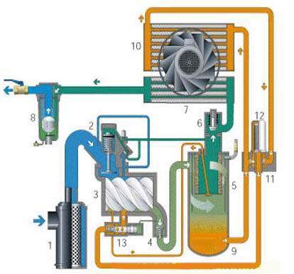 一个蓝色的大箱子里面一台电机和转子一个过滤器和气液分离器,再加上丙烷气冷却器和润滑油冷却器,好像就没什么了,但是还有一对白色的圆柱容器不知道是什么东东。大致的流程有点像这幅(在网上搜的),但不是本机的。希望大家能够提供准确点的资料。 螺杆压缩机.jpg |
