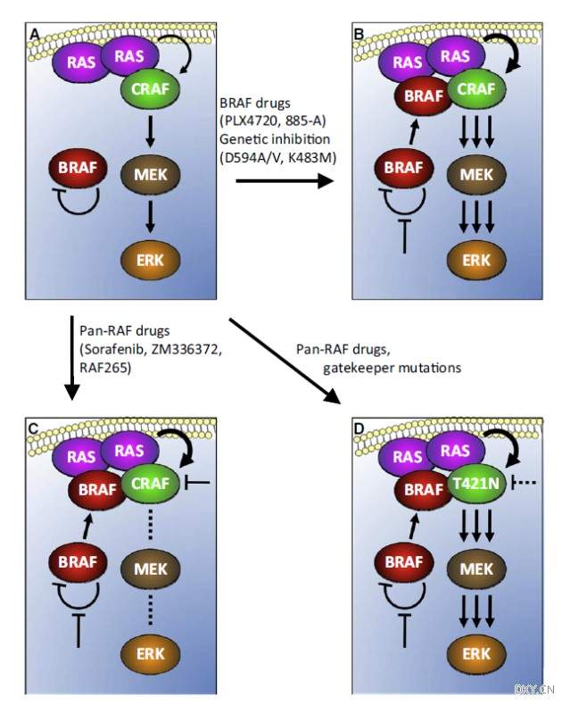 1.BRAF inhibitors drive RAS-dependent BRAF binding to CRAF, CRAF activation, and MEK-ERK signaling in oncogenic RAS revealing a paradigm of BRAF-mediated signaling that promotes tumour progression with clinical implications and highlighting the importance of understanding pathway signaling in clinical practice and of genotyping tumours prior to administering BRAF-selective drugs, to identify patients who are likely to respond and also to identify patients who may experience adverse effects such as increased invasion。 这是完整的一句话,有些长,主要想知道RAS-dependent BRAF binding to CRAF, CRAF activation, and MEK-ERK signaling ,a paradigm of BRAF-mediated signaling是什么意思 2.panRAF inhibitors with anti SRC activity |