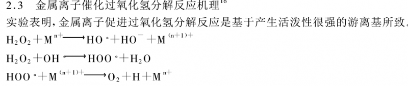 实验表明,金属离子促进过氧化氢分解反应是基于产生活泼性很强的游离基所致。其反应过程如下: