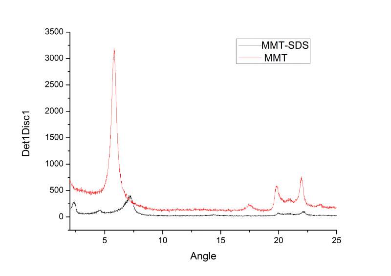 你的黑线出现好几条低角度的峰,说明有好几相,与红线对比可以看出有的层间距变大了,有的变小了。而且你的实验条件破坏的MMT的结晶度。