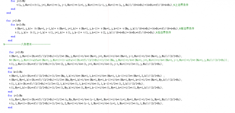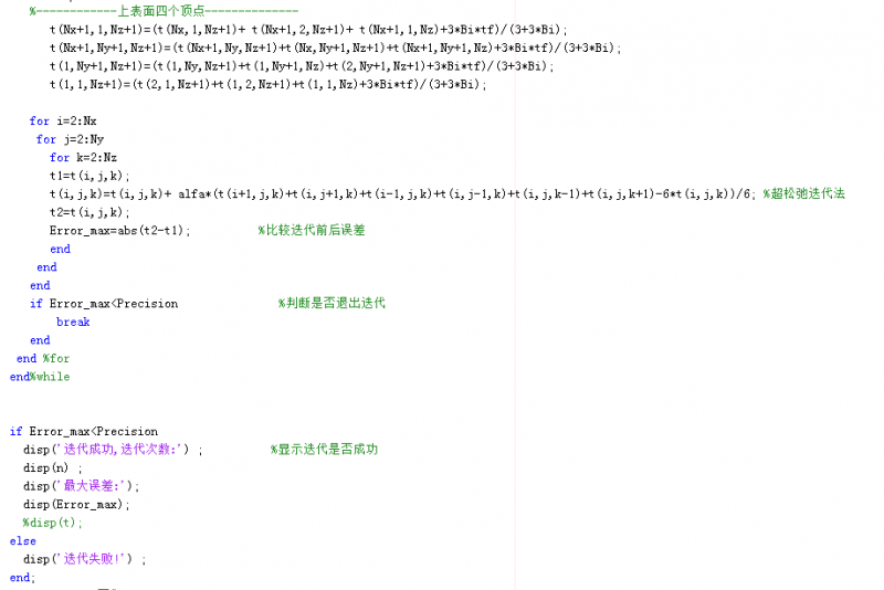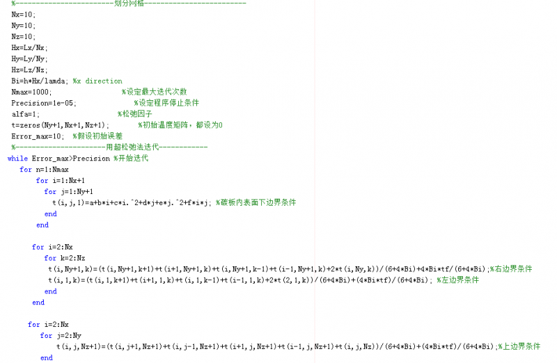 用sor解决三维稳态齐次偏微分方程,物理模型为一个立方体,为了求解其内部温度场。六个边界中,五个为对流边界,外界温度为25,另一个为已知边界温度。 运行后,发现温度越来越大,改变松弛因子后也是同样的结果。不知道是不是我的离散方程型式错误导致的不收敛,麻烦大神们帮忙看一看。 截图00.png 截图01.png 截图02.png |