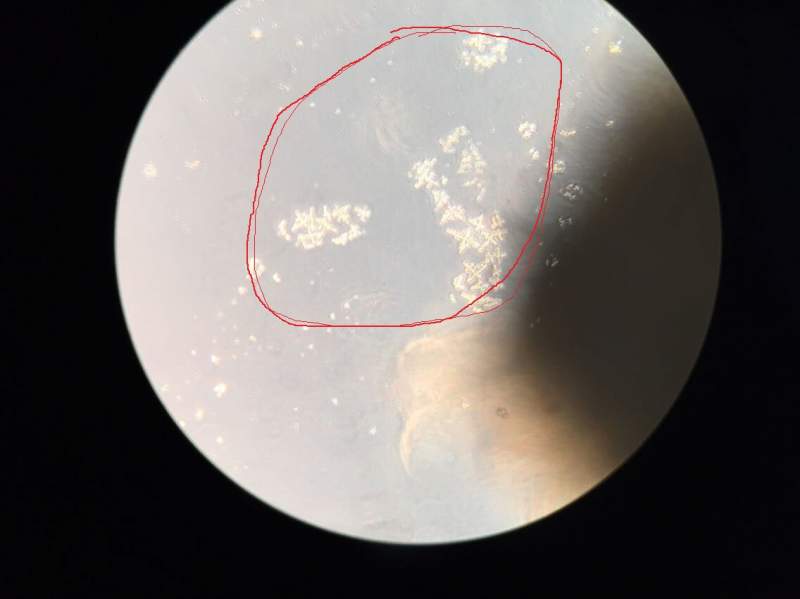 求助,我们用组织块直接培养法培养羊的成纤维细胞,阴影处组织块,红圈里的亮晶晶的什么?