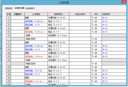 前段时间在南通的一家企业学习了几天扣式电池的封装,当时企业用的是新威测试扣式电池,回到学校后,我带回一些电池用实验室的蓝电测试,在工步参数上设置出了问题;我本打算设置的是0.1C、0.2C、0.5C、1C、2C各循环两次,但是我设置的逻辑估计出了问题,它每次只能在0.1C一直循环下去,不能到达下一步的测试,好几次我都是强制跳转才得以往下进行。以下我上传一张截图。 图片1.jpg |