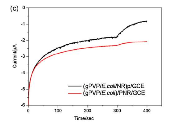 下面的这张图小虫有些迷糊了,文章正文里面说“ The signal at (gPVP/E. coli/NR)p/GCE was enhanced by about 3-fold than that of (gPVP/E. coli)/PNR/GCE”,即黑色线代表的电流是红色线代表电流的3倍。但我怎么觉得是红色线的电流更大呢?因为正负号只是代表电流的方向而已。想听听大家的意见!