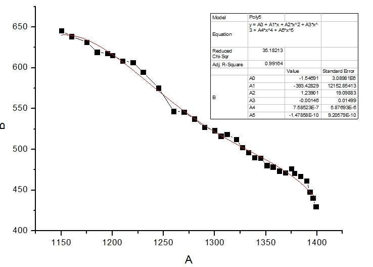 x y两组数据,采用5次多项式拟合,拟合曲线与实验点走势很一致,但是使用拟合方程在原始实验点计算的y值与实验值偏差较大,请问是什么原因,如图