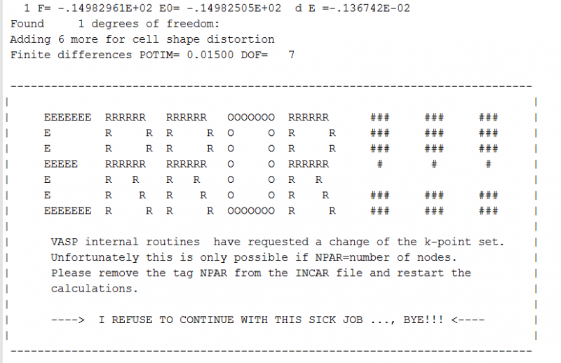 有关parallelisation,主要是关系到multi-core multi-node的运算的效率 NCORE和NPAR是差不多的,INCAR内声明一个即可。NCORE默认值为1。parallelisation只会影响运算效率,一般不影响运算的结果。 但IBRION=5,6貌似都只能用默认值算(也就是你不在INCAR声明NPAR或者NCORE,或者把这些注释掉),然后你用了默认值,输出文件里面肯定会提示你NPAR或者NCORE使用默认值计算的效率不高,此时忽略警告即可(因为你只能用默认值)。 还有,IBRION=6默认应该只取两个点(NFREE=2),加上strain=0的情况总共3个点,个人觉得不是很准确,因为拟合直线的话一般多取一些比较好(例如NFREE=4),然后调整好合适的strain的大小(POTIM默认为0.015Angst,根据你的体系调整) ref: parallelisation http://cms.mpi.univie.ac.at/vasp ... PLANE_KPAR_tag.html NCORE http://cms.mpi.univie.ac.at/wiki/index.php/NCORE IBRION=6、NFREE、POTIM: http://cms.mpi.univie.ac.at/vasp/vasp/IBRION_5_IBRION_6.html |