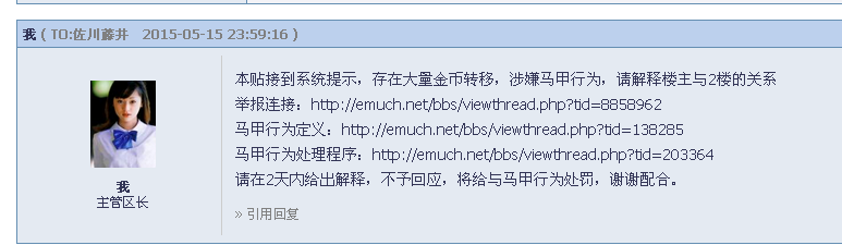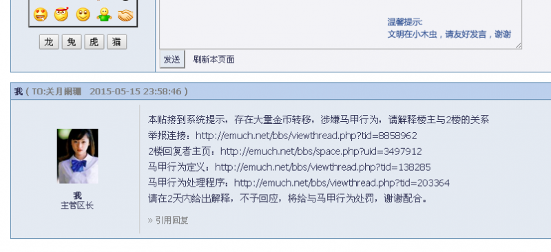 违规链接:https://muchong.com/bbs/viewthread.php?tid=8858962 由系统提示,本帖存在马甲行为嫌疑 2楼回复与求助者ID一致,IP:202.198.***.*** 按规定已给两人站内信 见截图,均无任何解释 扣除金币所得,并对两人马甲违规存档,再处罚每人100金币 现认定本帖存在马甲行为,公示如此 @关月阑珊 @佐川藤井 1.png 2.png [ Last edited by 费姚永芬 on 2015-5-20 at 12:24 ] |