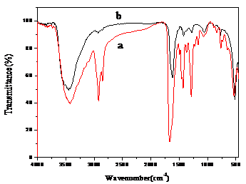 红色是以离子液体[C16mim]Br为溴源制备的溴化氧铋的红外谱图,黑的是以溴化钠为溴源制备的溴化氧铋的红外谱图,请大神帮忙分析分析特征峰。毕设和论文不同,这是导师发的图,并没有具体值。