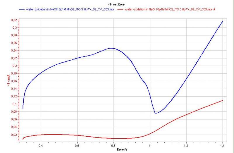 我在做MnO2水氧化时,MnO2是恒压方式电沉积在ITO载体上的,但是测试的时候在水开始氧化以前都会有一个很宽范围的正电流区,开始认为是因为沉积的Mn氧化不完全,但是在90C热处理30分钟后(图中蓝色曲线)这个电流更明显了,而且相当大。单纯的认为是MnO2氧化不太能解释通。请问这是什么原因呢?有没有可能在此区域已经开始水氧化了呢?