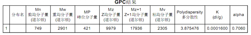 怎么觉得结果又问题呢?分散度3.875,Mp肯定不止一个啊。而且Mp-Mw-Mn-Mz都不在一个数量级,多分散性的聚合物如果要算分子量也得分段计算。你这结果是waters的GPC吧,给的结果太笼统了。