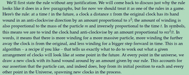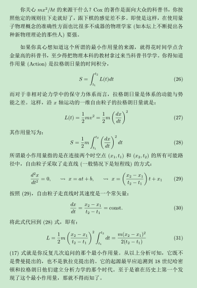 看Brian Cox的《量子宇宙》有以下几点不太明白的地方,不知道这里是否有人看过,并且能够讲解一二的? 关于用小时钟来代表概率幅的相位,这个在其他费曼的书中也都有见过,但在Brian Cox的书里对此的表述有几点我还是不太能明白: 1) 当计算粒子从某个位置范围迁跃到另一个离它“X个单位”的地方时,为什么代表概率幅的小时钟转的方向是“逆时针”,而且转的圈数是“X的平方”呢?(比如倘若为10个单位,则小时钟会逆时针转100圈)-----我只知道概率幅的模平方是概率,但没听说“相位”也需要平方啊。 2) 这个问题其实和第1个是类同的,就是书里作者说当粒子从某个位置范围迁跃到另一个离它“X个单位”的地方时,小时钟转过的圈数为:mx^2/2ht, 谁知道这个公式是怎么出来的呢? 3) 在推导海森堡不确定性原理的过程中,作者也表示,这其中的最小作用量(ACTION)实际就是小时钟逆时针转过的圈数,也就是刚才说过的mx^2/2ht,那么问题来了,为什么最小作用量是这个呢?选择这个作为作用量有什么特别的物理意义吗? 4) 作者在书里说,某个位置范围内的两个小时钟(代表概率幅)迁跃到X单位之外的某处,要想不彼此全部抵消掉,需要两个小时钟逆时针转过的圈数不大于1圈,可是我理解,只有像类似12点与6点,3点与9点这样差180度,也就是0.5圈的相位才会彼此抵消掉,那为什么“圈数差”不是<0.5 而是必须<1呢?这个也有点不太明白。 还请明白的同学给解释解释,谢谢~ |