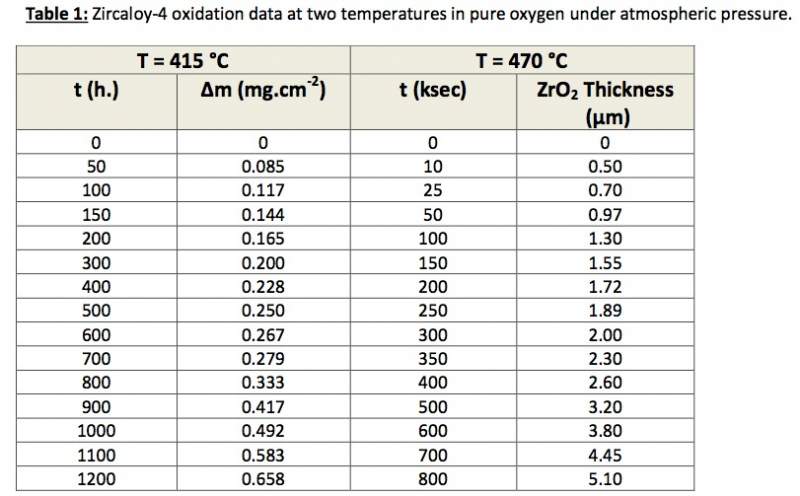 In the primary circuit, liquid metal exists under 100 bar pressure at 315°C and alloy oxidation leads to the almost exclusive formation of zirconia, ZrO2. In order to simulate this behaviour in a lab out of a reactor, oxidation in autoclaves is carried out under pressurized water vapour or even in oxygen under atmospheric pressure. The kinetic data has been obtained in the latter case, at 415 and 470°C, respectively, is given in Table 1. It will be assumed in the following exercise that only ZrO2 is formed during zircaloy oxidation.