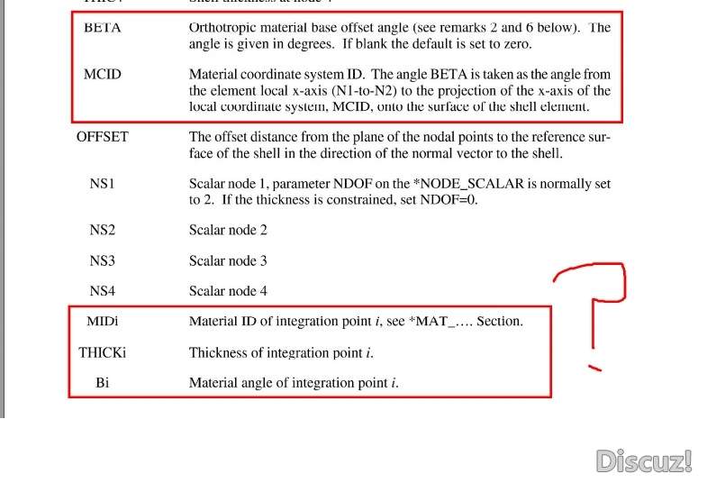 问题描述: shell单元中定义积分点的角度(Bi)是什么含义?我的理解是,如果定义好了材料的方向,网格已经画好,那么积分点就可以得到了,例如Gauss积分点的位置和权系数都有相关表格可以查,或者Hammer积分等。求大神解惑。 十分感谢! ![]() ![]() ![]() ![]() PS:附件为LS-DYNA手册的一部分 Shell.jpg |