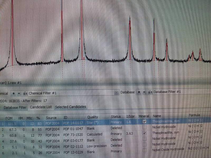 不是检索出来了吗?样品的结晶相是Ni(OH)2,表中的5个PDF卡片都能与其匹配。实验员给你在晶相PDF 73-1520上打了钩,告诉你图上标的红线对应这个卡片,你可以按卡片号找到它,就能得到标准卡片d-I或theta-I数据用于作图了。表中其它卡片质量不高,一般不能取做参考,特别是表明deleted的卡片,通常是选择标star的卡片作参考,奇怪的是实验员怎么搞的把这个卡片漏检了呢?