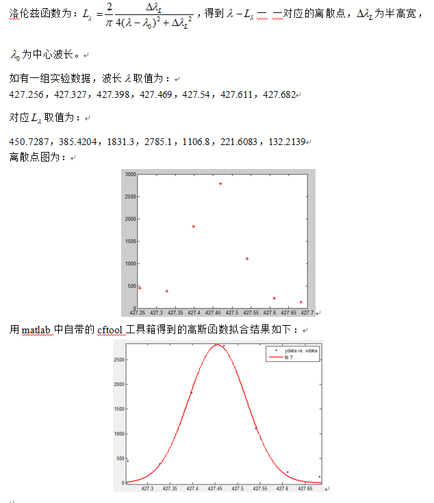 实验测得的激光光谱数据是波长—强度一 一对应的离散点,我想用matlab对某一小波段内的离散点做洛伦兹函数拟合,但是不知道该怎么做光谱轮廓的曲线拟合。附件中的图片是对问题的详细描述,希望有高人指点。用matlab中的cftool可以做出高斯函数拟合,如附件所示,但本人还是想通过matlab编程形式实现。 L{6J@(7VE3I(SO2Y6VVFAN1.png |