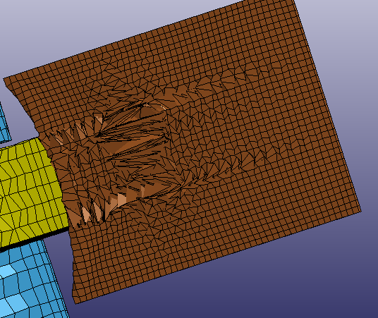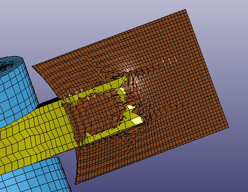 我做一个锤头撞击板材的仿真,板材用的是Solid164单元,Plastic Kinematic材料,与锤头的接触设为面面侵蚀接触,但是仿真的结果是这样的。