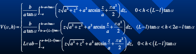 V3=L*pi*a*b-int(z*sqrt(a^2+z^2)+a^2*asin(z/a)+pi*a^2/2,z,h-a-(L-l)*tan(alfa),z,-a,a-h+l*tan(alfa));%第三段公式