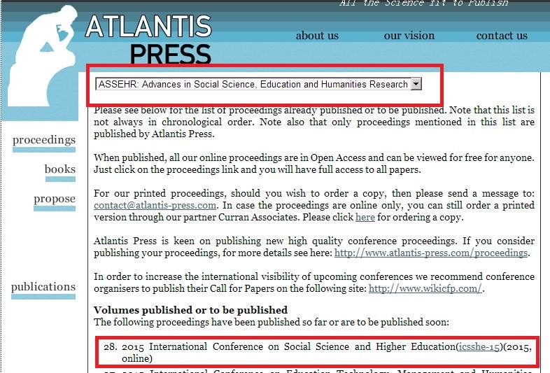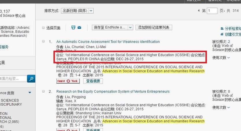 2015社会科学与高等教育国际会议将于2015年12月26-27日在美丽的三亚举办。会议旨在向国内外从事社会科学与教育的相关领域工作的专家学者、高校师生、科研人员等专业技术人员提供一个有深度、有广度的交流平台。 会议文章需要全部英文撰写,会议收录的所有文章将全部保证ISTP-CPCI检索(因为学术道德问题不被检索的会务组不负责)。 所有录用文章全部由Atlantis Press下期刊Advances in Social Science, Education and Humanities Research (ASSEHR) ISSN 2352-5398出版,刊物检索正常自己可查Web of Science (出版社支持https://www.atlantis-press.com/in ... rdering-2.php%3Fall) 论文选题不限,鼓励选题方向:社会科学,经济,高等教育 宏观经济学;理论经济学;金融机构与市场;经济史;数量经济学;经济学理论;应用经济学;法与经济学;经济学方法论;经济系统;国际经济学;金融经济学;公共经济学;自然资源经济学;货币经济学;企业管理和商务经济学;区域发展经济学;环境经济学;世界经济;文化与社会;社会与社会政策;城市化;农业现代化;国际事务;社会学;社会史;科学与创新;社会福利保障; 成人教育;商业教育;教育发展的偶然因素;跨文化教育;跨学科教育;远程教育;教育政策与领导;教育管理;教育测量与评价;教育心理学;教育技术;平等的受教育机会;评估/绩效测量与评价;性别教育;全球教育体系;健康教育;高等教育;在全球背景下的国际教育;语言教育;自然科学教育;政策和教育;社会教育;特殊教育;教育和发展的相互关系;工程教育与培训;理论与工程教育实践;教育技术与管理;教育研究与发展;教育改革;教育质量保证;商业教学与教育;教育中的创新; 教育的其他领域 Atlantis Press 会议列表。 截稿日期:2015-7-20 详情请登陆会议网站:https://www.icsshe.org 投稿邮箱:icsshe@163.com 投稿系统:https://easychair.org/conferences/?conf=icsshe2015 电话:+86-18689570865 欢迎投稿! 2015社会科学与高等教育国际会议组委会 [ Last edited by gcl0515 on 2015-6-21 at 10:49 ] ICSSHE2015 出版3个月后全部被CPCI—SSH检索! 检索截图, 谢谢大家对ICSSHE2015的支持,ICSSHE第二届已经开始征稿,详见:www.icssheconf.org [ Last edited by gcl0515 on 2016-4-4 at 16:44 ] |