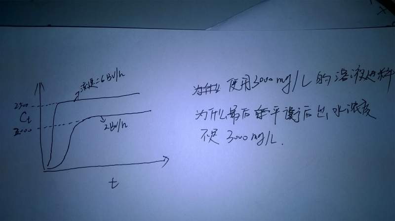 如题,我是用3000mg/L的浓度进料。最后达到平衡后的出水浓度为2500mg/L。而且不同流速平衡后出水浓度还不一样,请问这是为什么?本人新手,没有太多金币~~
