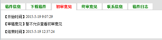 马上就要毕业了,投了一篇中文核心,论文急于见刊,因为见刊了才能毕业,急啊,求助有经验的朋友指点一下,图片上这是什么意思?为什么看不到初审意见啊?