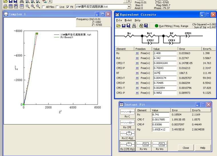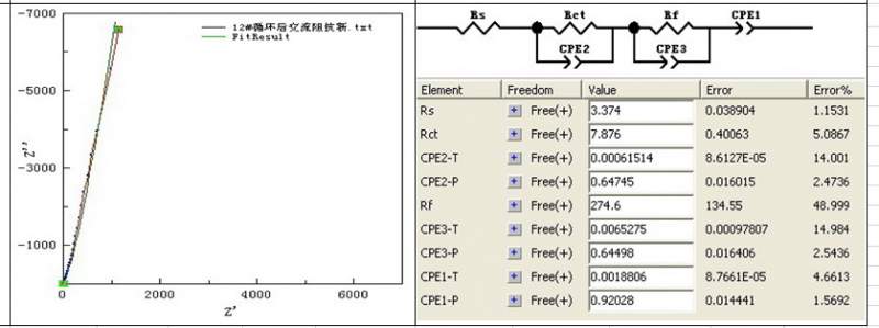 2.循环后,低频区的直线还算平直,但Rf却比循环前的还大,Rf的误差也很大。拟合得结果和原始的曲线重合度还算比较好,但误差比较大。更有一次: