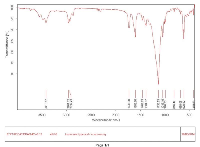 从图来看,可能有伯氨基(3415.12和相邻小峰以及1603.80和1136.53),羰基(1735.00),甲基(2961.12/2932.43/1462.63/1384.67)。不知楼主是未知化合物还是已知化合物归属呢?