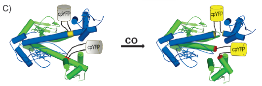 如图所示,cpVenus(circularly permuted variant of yellow fluorescent proteins)的荧光在亚铁血红素酶的两个氨基酸断裂后荧光恢复。但是实在是不明白为什么cpVenus的荧光会恢复,文中只是说cpVenus对构型的改变敏感,却没有说为什么构型改变之后就会出现荧光。对荧光蛋白这一块确实不太了解,查阅了好几篇文献也没看明白这是怎么回事。请大神们细心指教啊。感激不尽 文章链接为http://onlinelibrary.wiley.com/d ... .201203684/abstract QQ图片20150527214445.png |