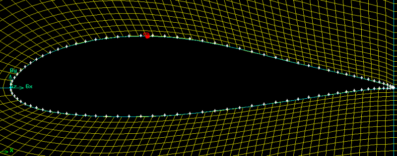 请问一下韩占忠的机翼空气流动仿真,网格加密时在机翼上取一点,是怎么知道这点坐标的啊,假如我想知道红点的坐标,谢谢