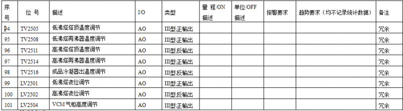 小弟是新手,最近在学DCS控制系统组态,遇到一点问题,想请教一下坛里的各位大虫,如图所示,在这些位号的设置中,那些备注,要求冗余是要怎么设置啊,可不是卡件冗余哦。还有那报表里,要求一天三班,8小时一班,换班时间为0点、8点、16点,8小时一班。这可要怎么设公式啊!求各位大虫多多指点指点啊。 备注中的冗余如何设置.png 报表中的红色字体要求怎么设置公式.png |