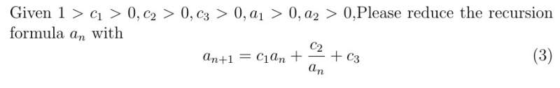 根据递推公式求出通项公式来,谢谢。 选区_001.png 已经知道: 0< c_1 <1 , 0 <c_2 ,0 < c_3 , a_1 > 0 ,a_2 >0; 递推公式: a_{n+1} = c_1 * a_{n} + c2 / a_{n} +c_3; 然后是求出a_{n}的通项公式来。 选区_002.jpg |