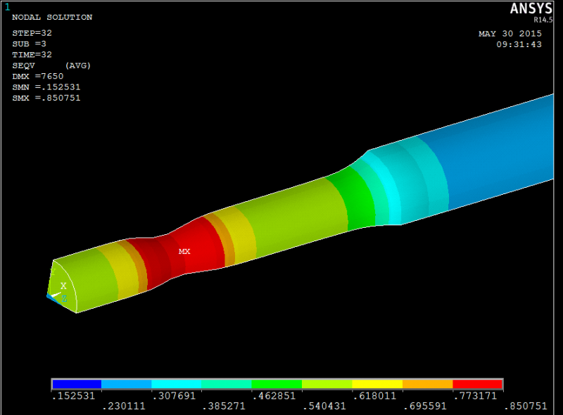 图上所示坐标系,我在YZ面上加X方向的约束,XY面加Z方向约束,XZ面加Y方向约束,结果颈缩并未出现在X=0的位置,这到底是怎么回事?是不是我约束加错了?