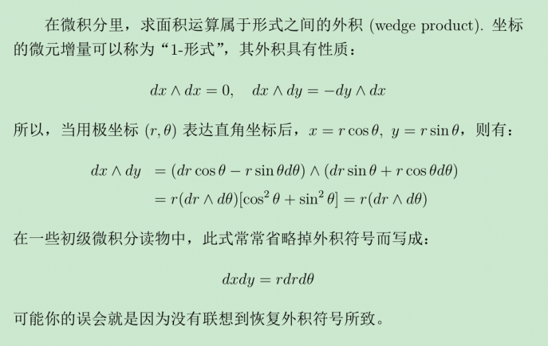对于直角坐标系转换成极坐标系的问题 x=rcosθ y=rsinθ 得到:dxdy=r dr dθ 具体的推导过程:dx=d(r cosθ)=-rsinθdθ+cosθdr;dy=d(rsinθ)=rcosθdθ+sinθdr;所以dxdy=r cos2θ dθ dr 其中已经舍弃了drdr和dθdθ项了, 但是书上是dxdy=r dr dθ,我不知道这个哪里不对?求大神帮忙 |