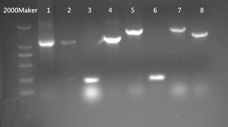 图里泳道1,2都是用自己设计的引物P出来的目标基因 ,3-8是菌落PCR的结果。泳道4的是正确的目标基因,已经测过序了。