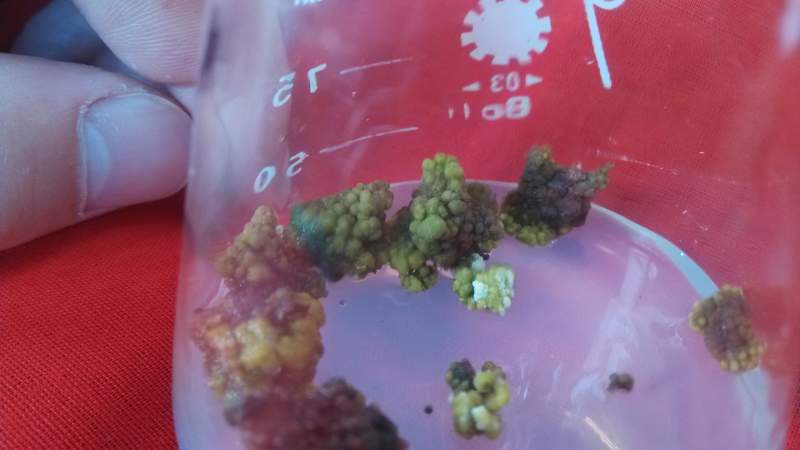 柳树愈伤组织生芽如图,愈伤组织上出现较大颗粒,是不是体胚呢?有的愈伤组织表面有白色小颗粒,诱导愈伤生芽近30多天还没出芽,求大神帮助。激素加的是6-BA和IBA。有没有做过愈伤生芽的朋友? 茎4雄4月18号生芽 (4).jpg 茎6雌生芽.jpg 茎16雄生芽2.jpg |