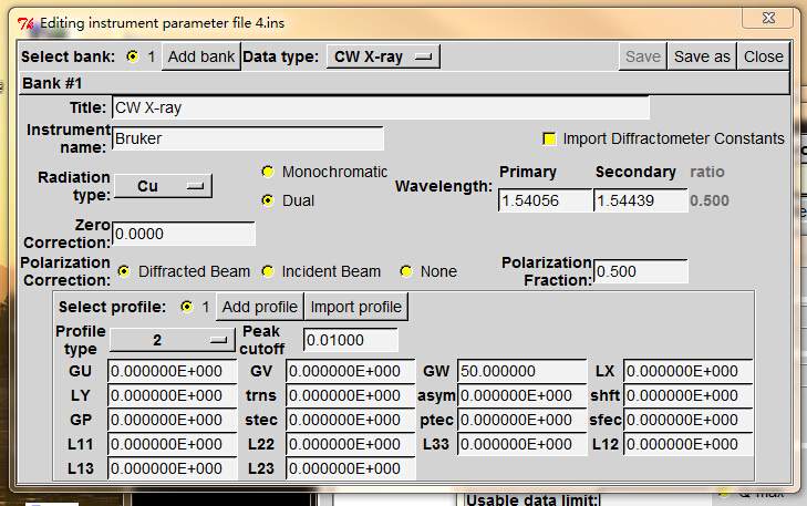 图示是仪器信息设置。峰型参数可以用cmpr软件拟合得到