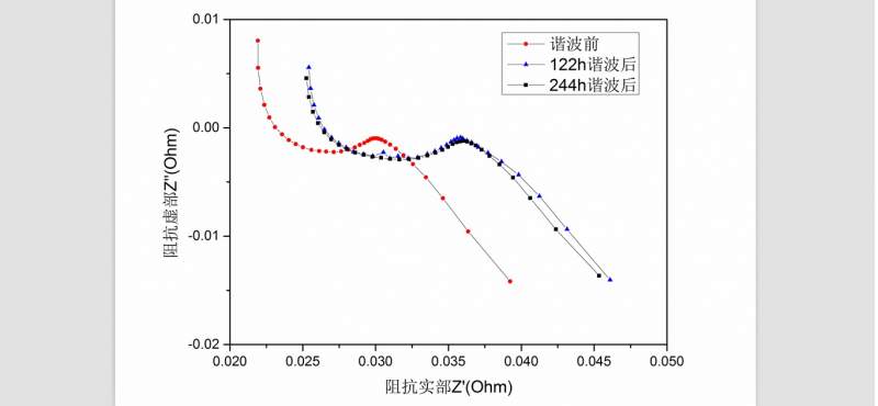 对正极镍钴锰酸锂/负极石墨的锂离子电池做对比实验,一共3个阶段的对比,现在发现第二阶段的和第三阶段的曲线基本重合,相对于第一阶段都是阻抗实部增大了、虚部基本不变,想问一下,这可能是由于什么原因呢? 阻抗谱曲线如下 |