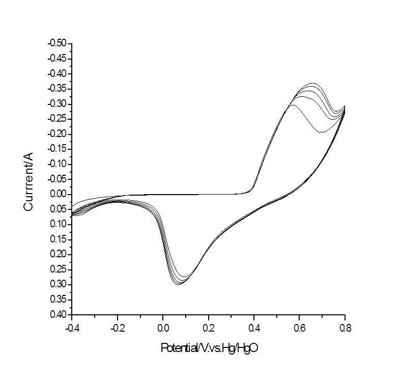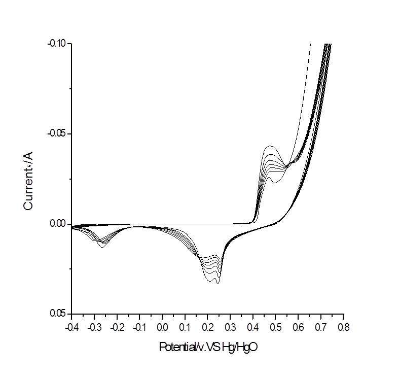 我这个CV曲线是在0.5mv/s的速度下扫的,不知道为什么还原峰的峰为什么拐的那么不正常,请问哪个大神遇到过这种情况,求解答。另一个图片是10mv/s扫的就没有事,请问这是怎么回事。我用的参比电极是Hg/HgO,对电极用的泡沫镍,这个应该没有问题吧。