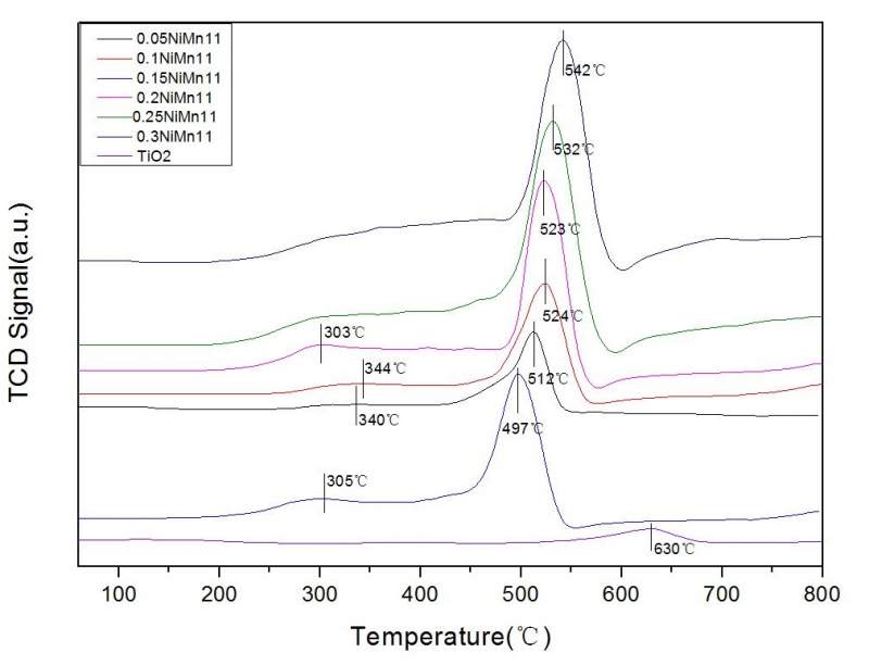 楼主做的是不同负载量的NiMn/TiO2催化剂的TPR测试。