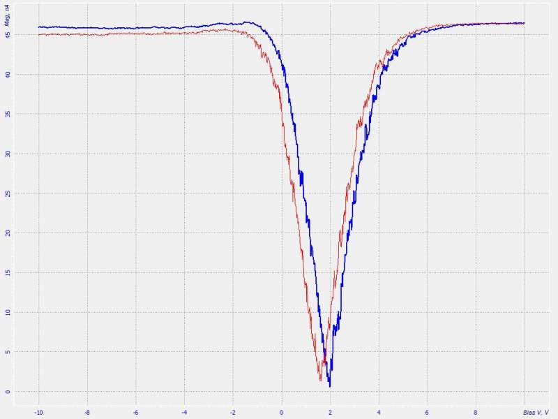 采用NT-MDT仪器的PFM模式测定AlN压电薄膜的压电系数d33,曲线为什么是这个样子的??