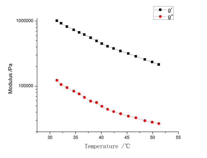 小弟采用哈克旋转流变仪做了15%明胶溶液的震荡温度扫描,想获得溶胶凝胶转变温度,即储能模量和损耗模量的交点,但是如图所示储能模量一直比损耗模量高,实际溶液在降温前是液体,降温后呈固体。不知道是哪里出了问题导致作出如此图样。 Graph1.jpg |