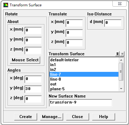 想请教,我在流体区域沿X方向画了一条线,现在需要将这条线绕Y轴旋转30度,我做的是3D模型,这样的旋转式在下面的面板中操作吗?请问这个面板怎么操作啊???跪求!!!!!