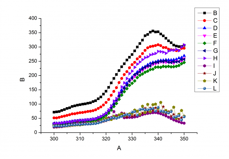 求助各位大神 我在用芘测胶束cmc的时候, 用的6*10 -7mol/l 的芘在不同浓度的胶束溶液里, 激发光是非颠倒336nm, 然后emission扫的是300-450nm的峰值, 结果只在336nm处有一个峰, 其他的位置都没有峰, 求助是什么原因呢??? 难到芘没有进入到胶束空腔里? 还是测的时候设置的不对?? 在线等~~~~~ |