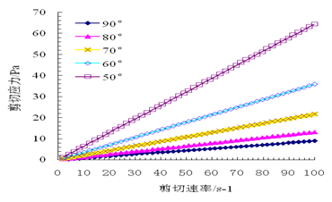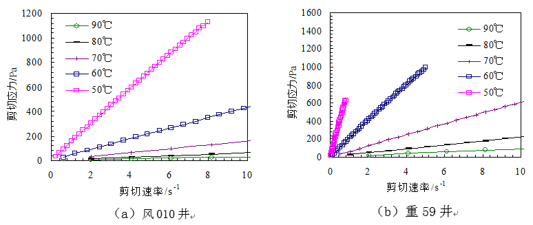 风010井、重59井油样粘度都很高。风010井油样粘度在50-70度间变化最大,超过70度,粘度随温度变化的幅度较小;重59井,50-80度见粘温变化明显。所以前者集输温度宜选择70度,后者80度。然后可以展开温度没增加10度,粘度的变化情况。