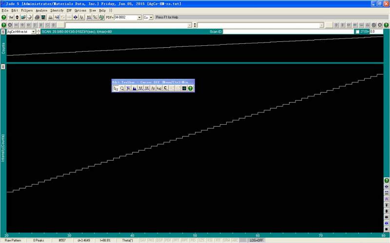 大家好!最近做了XRD,得了个txt数据(如附件所示,没有存raw文件,只有这个txt),想用jade计算下样品的晶粒尺寸啥的,但是发现经过如图“Setting”所示的设置之后,导出数据如图“Wrong”所示(完全不对啊)!请教下各位大侠,到底是哪里设置出了问题呢?谢谢啦! Setting.jpg Wrong.jpg |