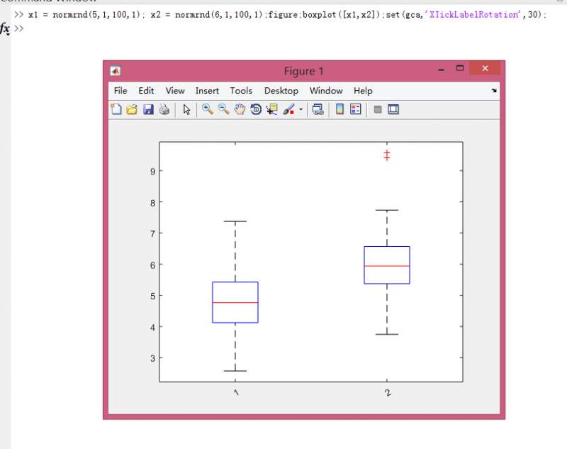 MATLAB 无法获得boxplot X轴的刻度句柄, 本来实现xticklabel的旋转(即X 轴上标记之间太挤了,想要把标记斜着放),这个句柄得不到,就处理不了。 x1 = normrnd(5,1,100,1); x2 = normrnd(6,1,100,1); boxplot([x1,x2]) xt = get(gca,'XTick'); xt的结果为empty. 有遇到过类似情况的吗? |