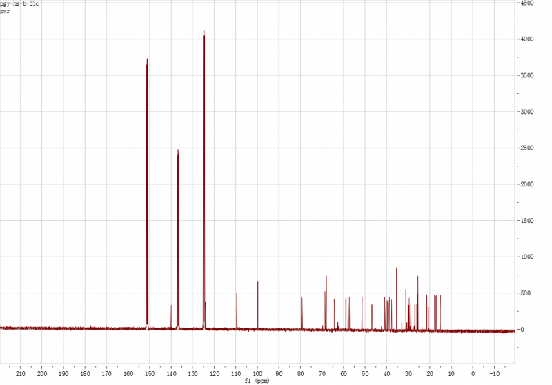 碳谱31C:15.07、16.74、17.39、17.67、20.68、21.41、25.48、25.65、25.92、26.86、28.81、29.54、29.74、29.92、30.02、31.05、35.33、37.74、38.71、38.88、39.76、40.38、40.77、40.9、46.84、51.35、57.35、57.81、58.88、64.24、68.03、68.59、79.22、79.53、99.79、109.58、124.07、139.99